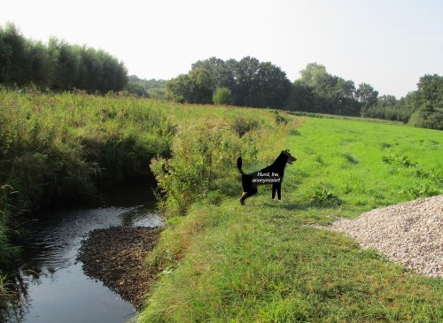 Es dauert auch nicht lange, da bevölkert – weit entfernt vom „Herrchen“ – ein frei laufender, „zur Natur gehörender“ Hund die Wiese, stöbert am Bach herum.