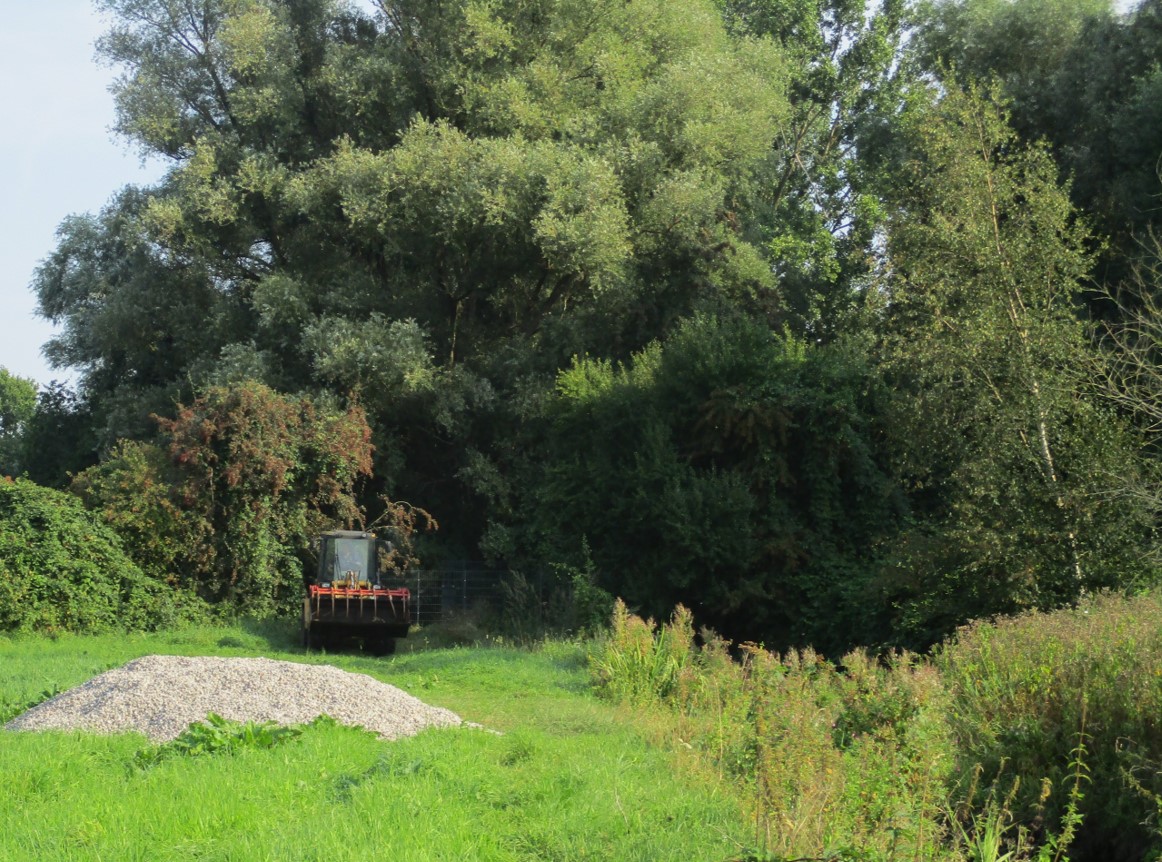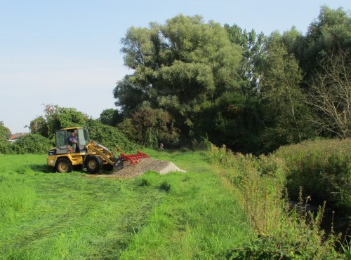 Wie üblich setzt die Schaufel auf der Uferkante auf, der Kies rutscht in den Bach, baut den Schüttwinkel auf. Schwerpunktartig werden 4 neue Punkte beschickt, 3 ältere werden uferseitig ergänzt.