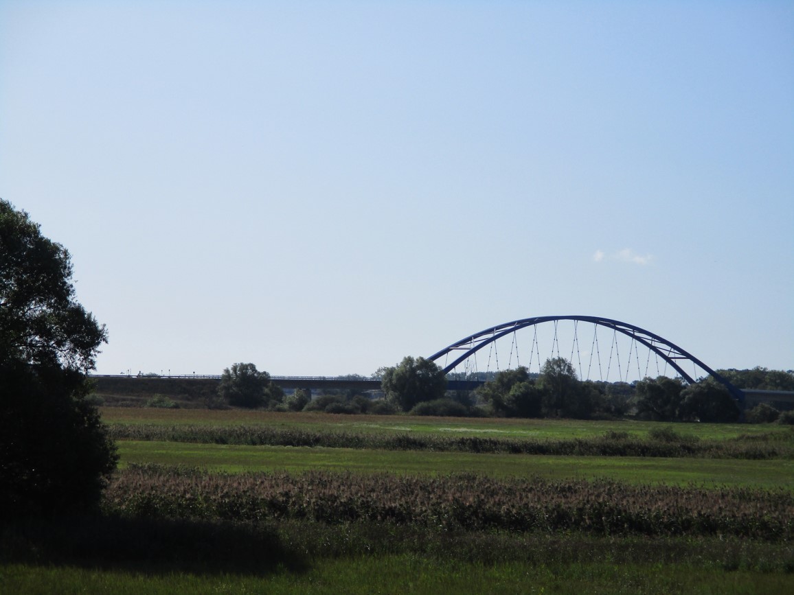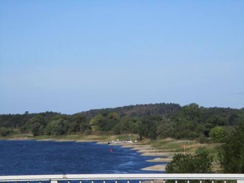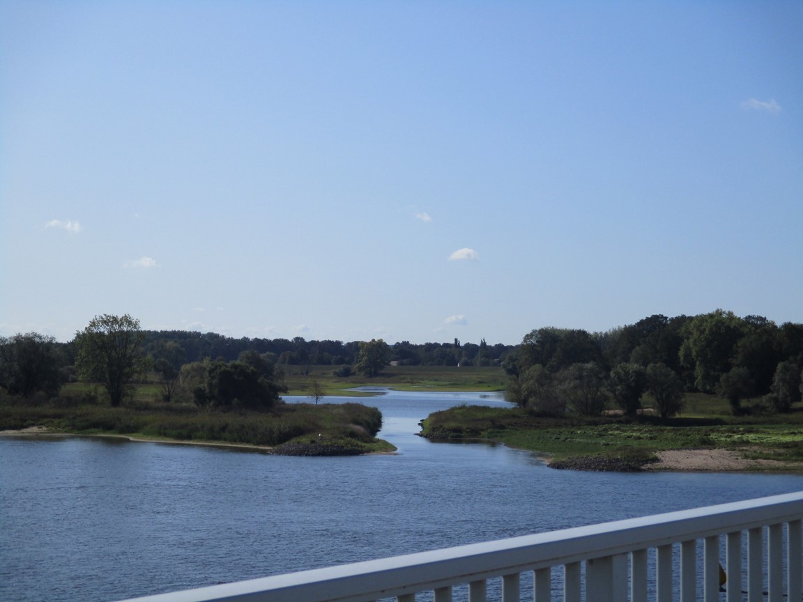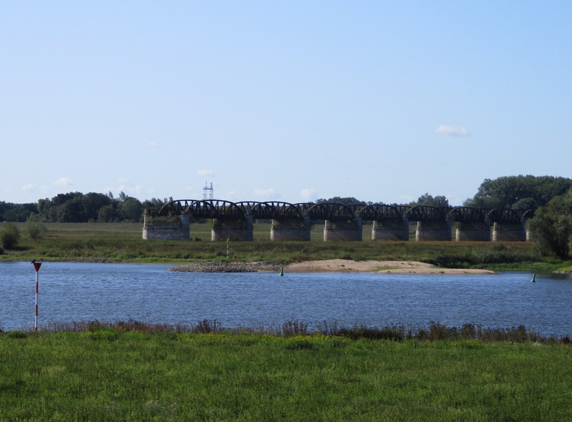 Blick Elbe-abwärts, langanhaltendes Niedrigwasser hat örtliche Schifffahrt aus dem Dömitzer Hafen nach abwärts der Brücke verlegt. PendelTouren wurden verkürzt.