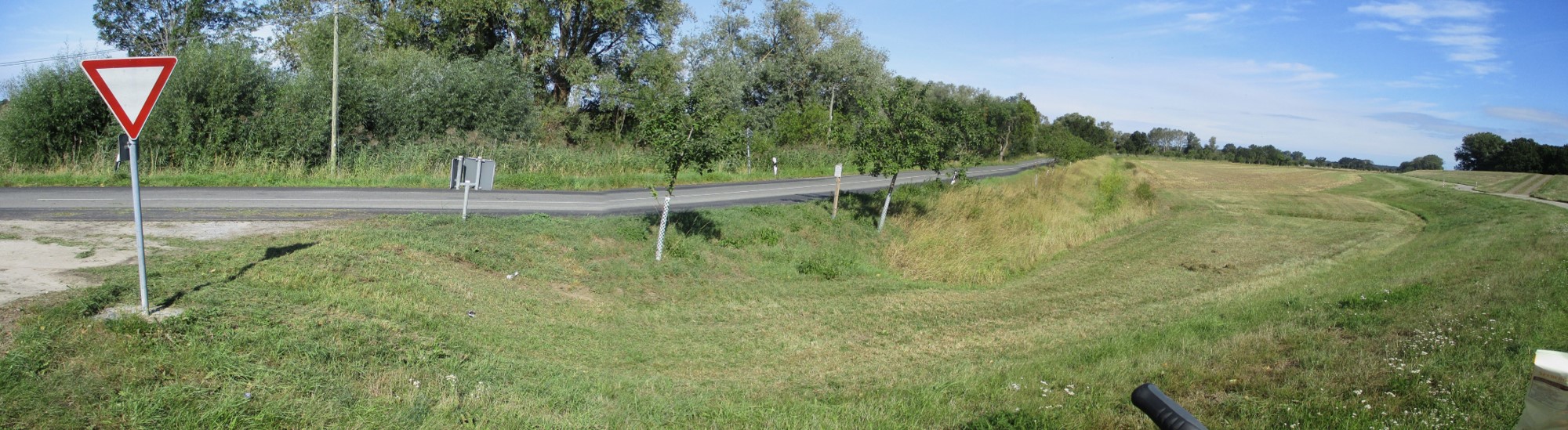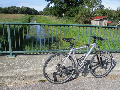 Niedersächsische Agrarlandschaft – Bäche, hier die Krainke, zu erhitzten Entwässerungsgräben. – Im Vordergrund eins der kostenlos von unseren Gastgebern zu leihenden Rädern. Besten Dank nochmals!