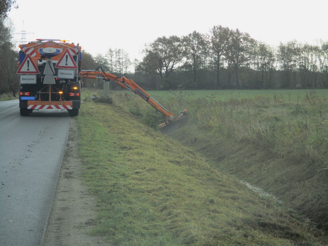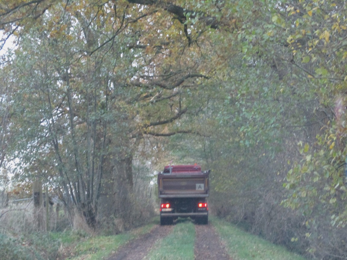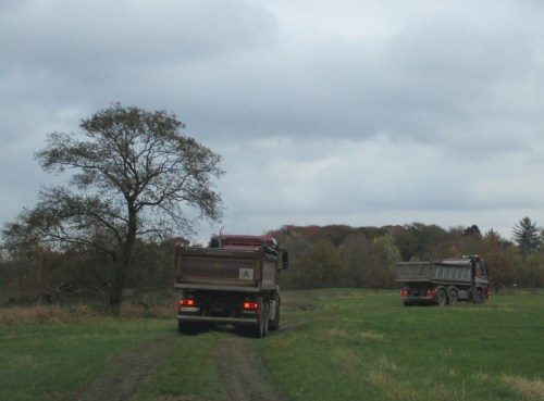 Die Baustellensperre stand offen. Wie sich herausstellte, waren einige Dutzend Jäger auf Jagd nach Hasen und Fasanen (ca. 13 bzw. 3 waren im Vorbeiradeln bereits auf dem Hänger zu sehen).