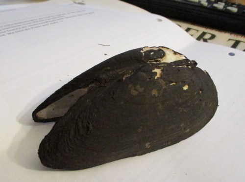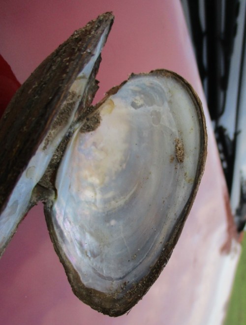 Mit dieser, immerhin für die Gattung klaren Ansage „Unio“ komme ich bei „meiner“ Muschel, jüngst an der Pinnau gefunden, zur anderen Gattung „Anodonta“. Die ist als „Teichmuschel“ also eher als Larve aus Mühlenteichen oder Neben-Stillgewässern in das Fliessgewässer Pinnau gelangt.