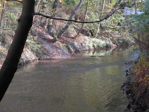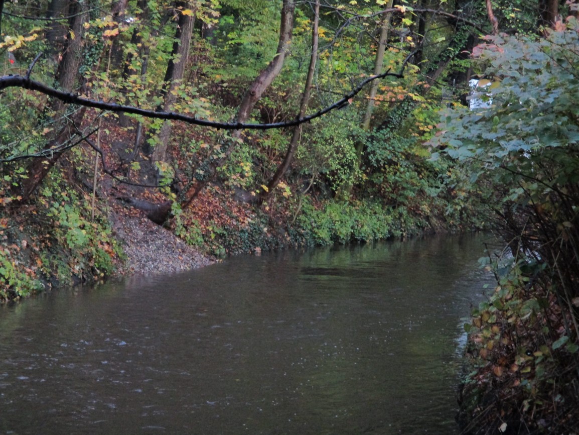 2 Tage zuvor – Blick von der Bahnunterquerung bachauf – nach einmaligem Schaufeleinsatz, etwa mittlerer Abfluss.