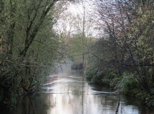 Brückenblick bachab – gut erkennbar stellen sich die durch die Kiese induzierten, mittig ausgerichteten Bach-Turbulenzen dar.