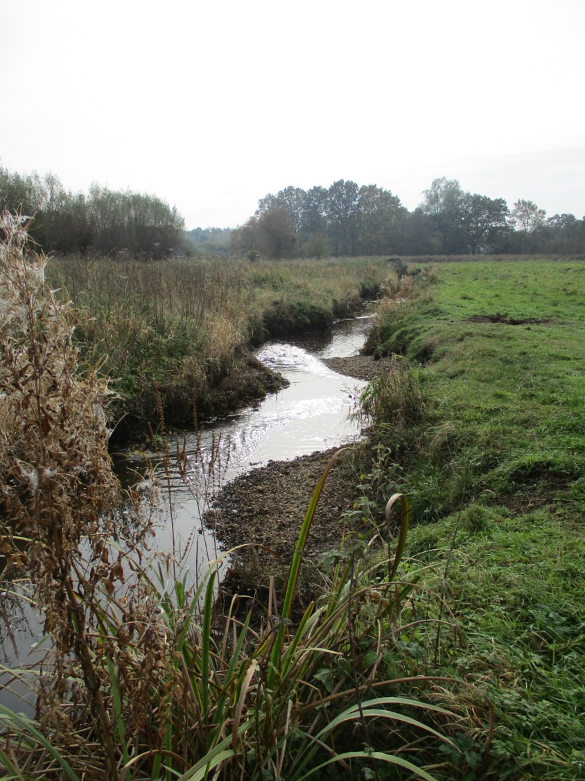 Blick bachab der Experimentierstrecke. Der Bachverlauf und die Sohlstruktur ist bereits erkennbar verbessert. Kolk-Rausche-Abfolgen charakterisieren den vorher auf Sand-Schlamm-Sohle kanalartig öde fliessenden Bach.
