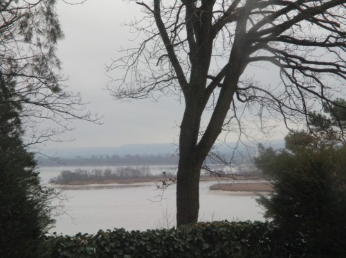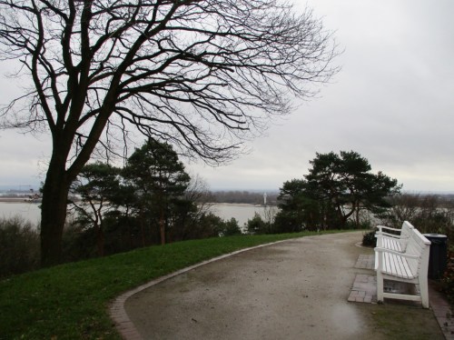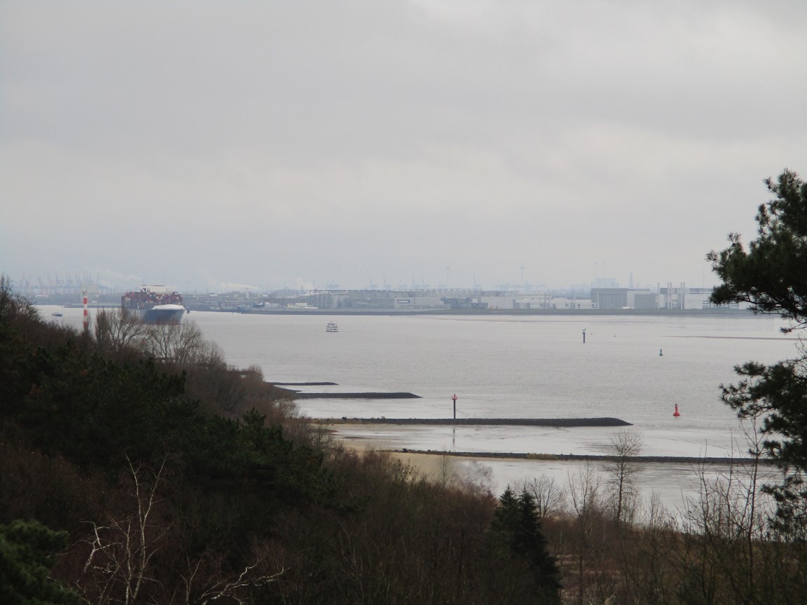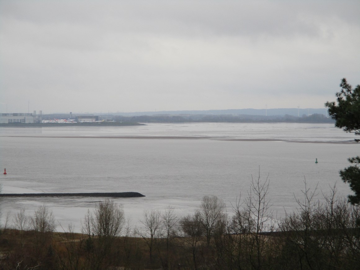 Blick über Sandstrand und Watt Richtung Schulauer Hafen. – Erstaunlich, hier auf dem Deich stehe ich im Windschutz …