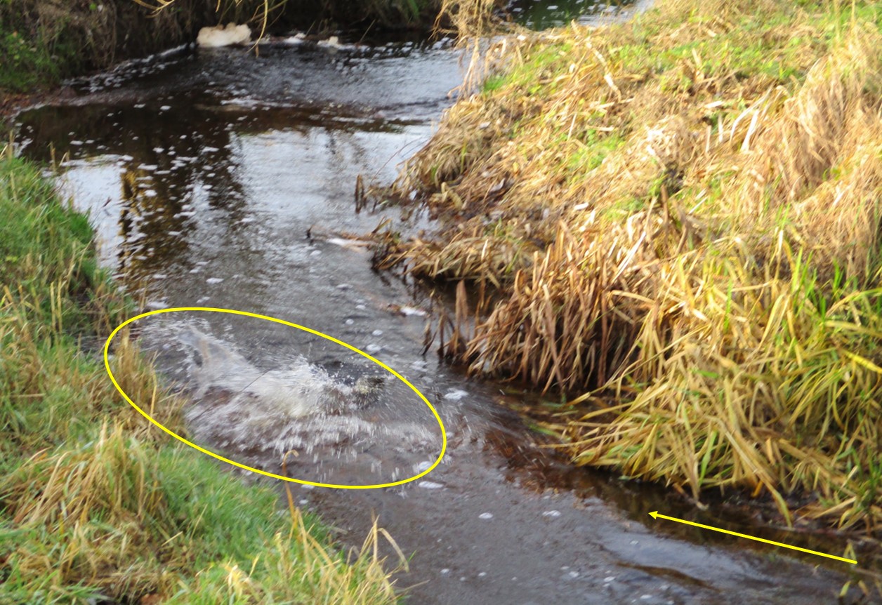 Während (mindestens) einer in die Tiefe des aufwärtigen Kolks wegtauchte, raste (Pfeil neben Welle) ein anderer bachab. Auf der durch das Laichgeschäft aufgeworfenen, nur flach überströmten Rausche erfolgte dann ein starker Flossenschlag, um das Verschwinden im Kolk bachab zu beschleunigen (Oval) – Platsch!