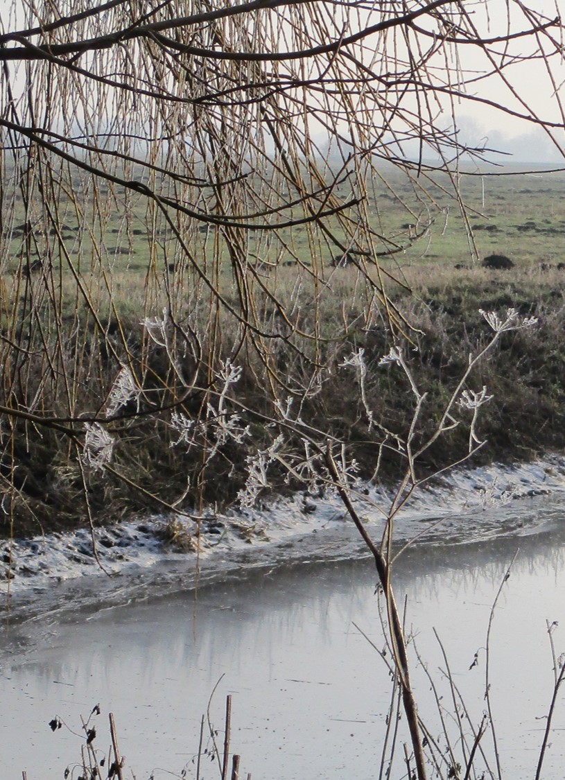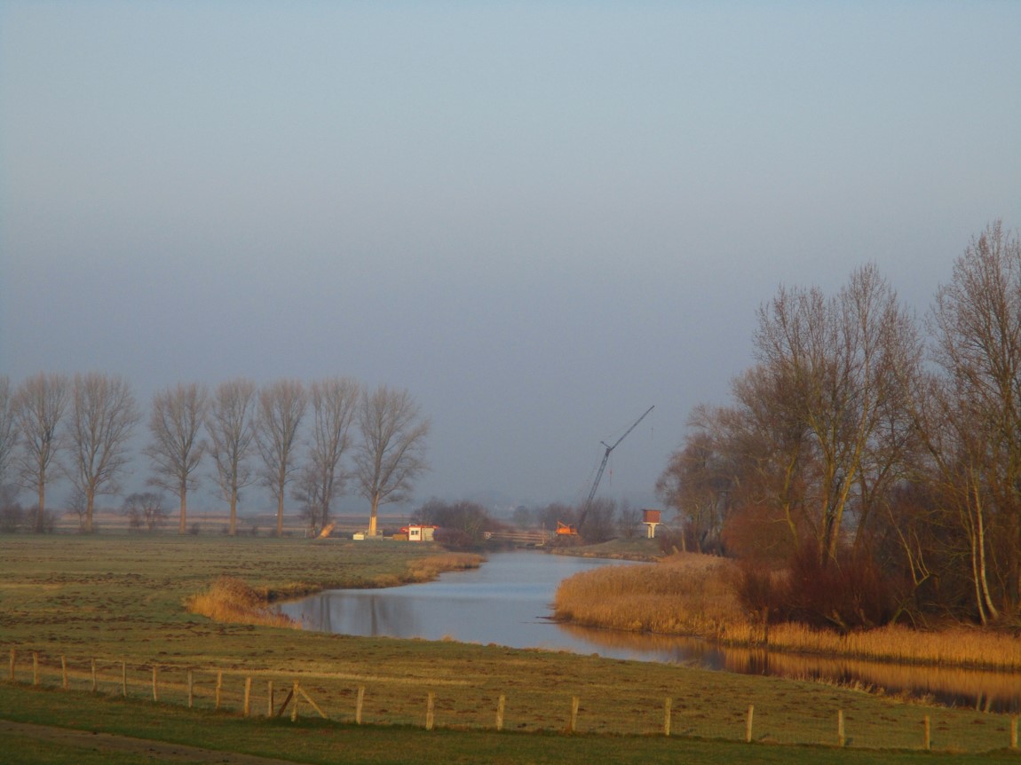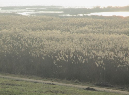 Beim alten Hetlinger Heuhafen radele ich nochmal auf den Deich, Tideröhricht in letztem, morgendlichem Gegenlicht.