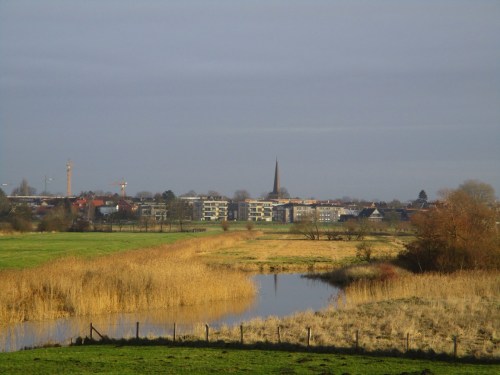 Blick vom Hauptdeich über die – volle – Binnenelbe auf Wedel in der Morgensonne. Dahinter, über der Geest, ein gut kontrastierender, dunkler Himmel.