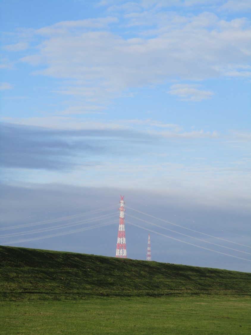 Die Hochspannungsleitungen über die Elbe jenseits Hetlingen – auch vom dortigen Horizont ist das Zuziehen des Himmels nun erkennbar.