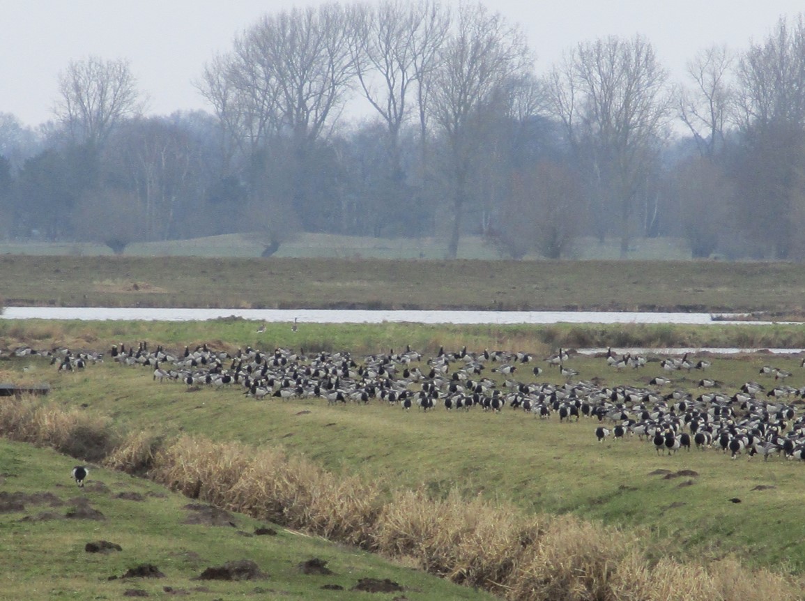 Eine Pionier-Gans hat sich getraut, allein jenseits des Grabens zu äsen. – Da hat sie mehr für sich.