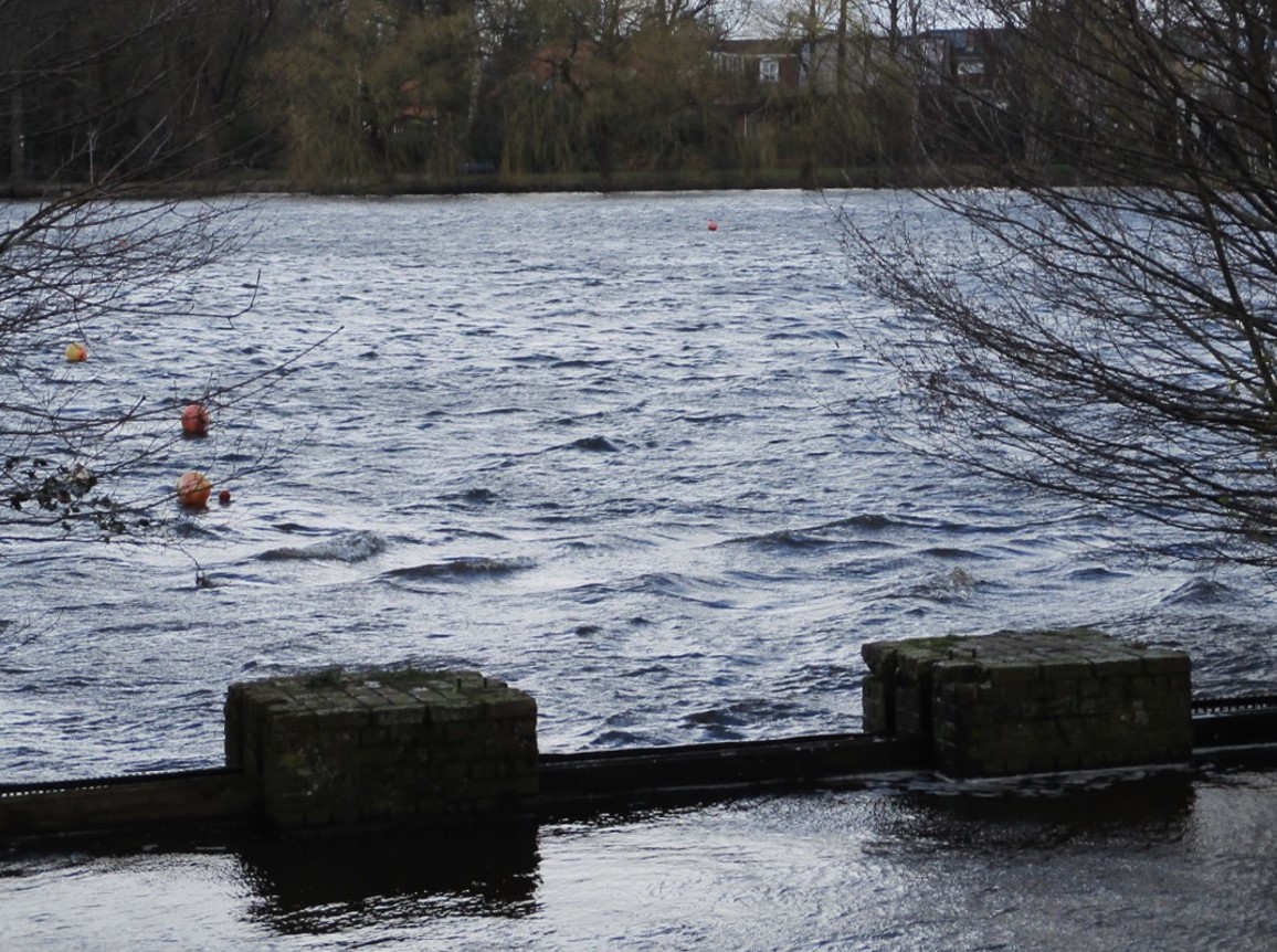 Auf dem Weg und zurück passiere ich die Zulaufstelle zum Rantzauer See. Vorn liegt im Lee der Büsche die Krückau, auf dem See überschlagen sich teils die Sturmwellen.