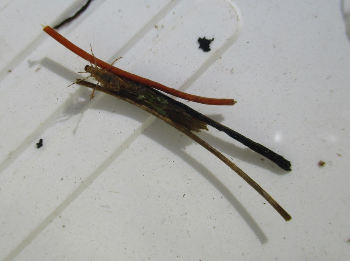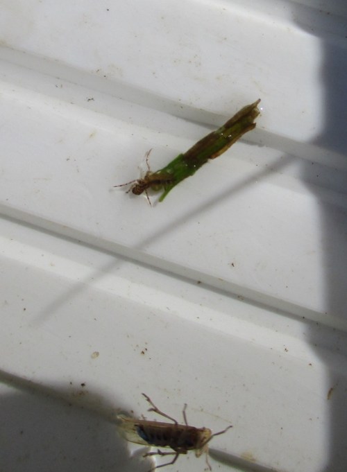 In den ufernahen Pflanzen leben auch Köcherfliegenlarven. Diese Art, vielleicht Anabolia, baut ein spezielles Haus mit Stängeln an den Seiten.