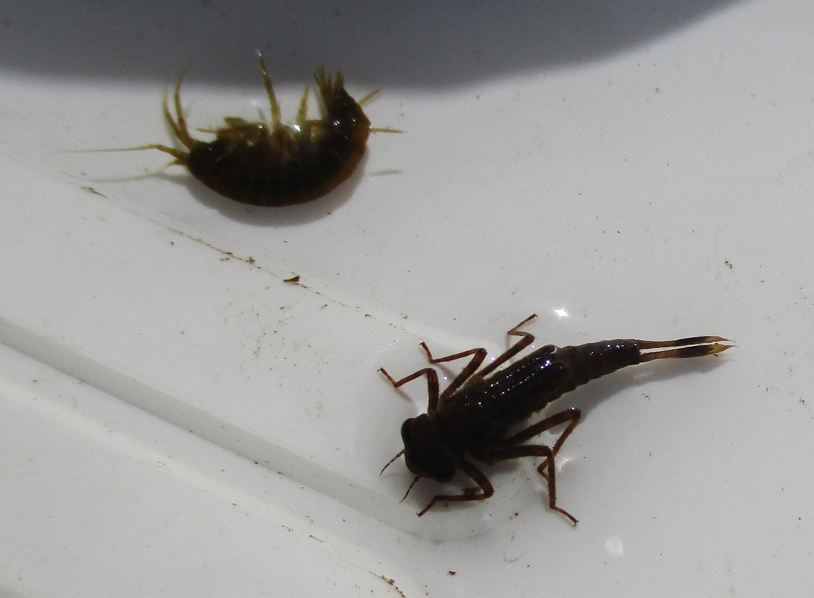 Die Bachflohkrebse in diversen Größen sind wieder zahlreich vertreten. Hier als Besonderheit fand sich auch eine mir bisher nicht untergekommene Libellenlarve. Aus der Fachwelt wird auf Federlibelle oder eine Schlanklibelle getippt. Schön, sie zu sehen.
