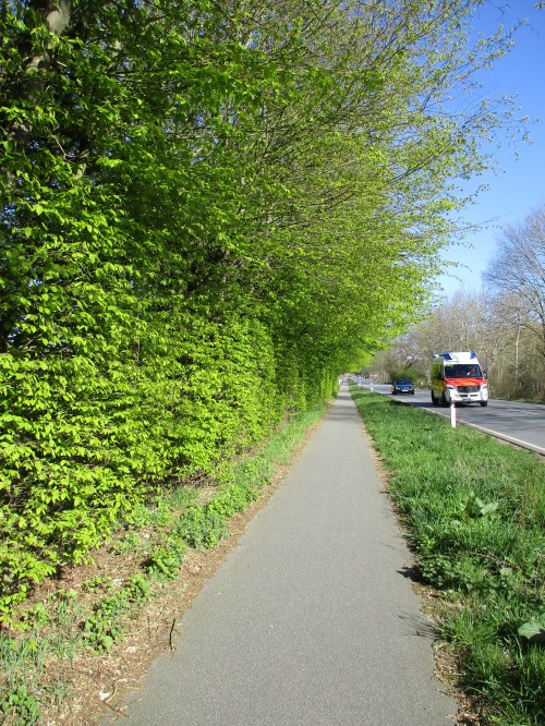 Dichtes Maigrün überrascht mich bei der Anfahrt entlang der B 431, eine „ausgewachsene“ Hainbuchenhecke, mit Dachüberstand.