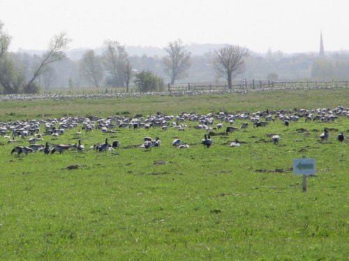 In der Hetlinger Marsch zwischen altem Deich und Elbe-Hauptdeich – ein Hinweis(?)schild. Da sind Tausende Nonnengänse, 2 äsende Schwärme – ich suchte ja Regionales, Saisonales …