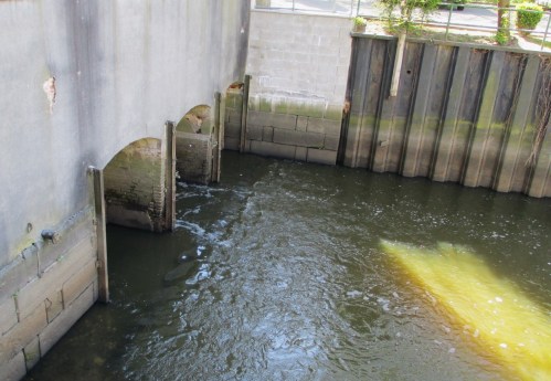 Flach fliesst die Krückau angesichts geringer Wasserführung bei Tideniedrigwasser durch die drei Durchlässe der ehemaligen Wassermühle. Die Durchwanderbarkeit für Gewässerorganismen ist fast über den ganzen Tag gegeben.