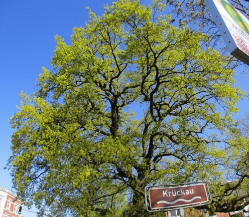 Bachauf sieht es nicht anders aus – alles verbesserungsfähig. Nicht unerwähnt bleiben soll eine beeindruckend blühende alte Eiche gleich neben der Brücke – möge dieser Baum mit möglichst vielen ähnlich ortsprägenden noch Jahrzehnte erhalten bleiben!