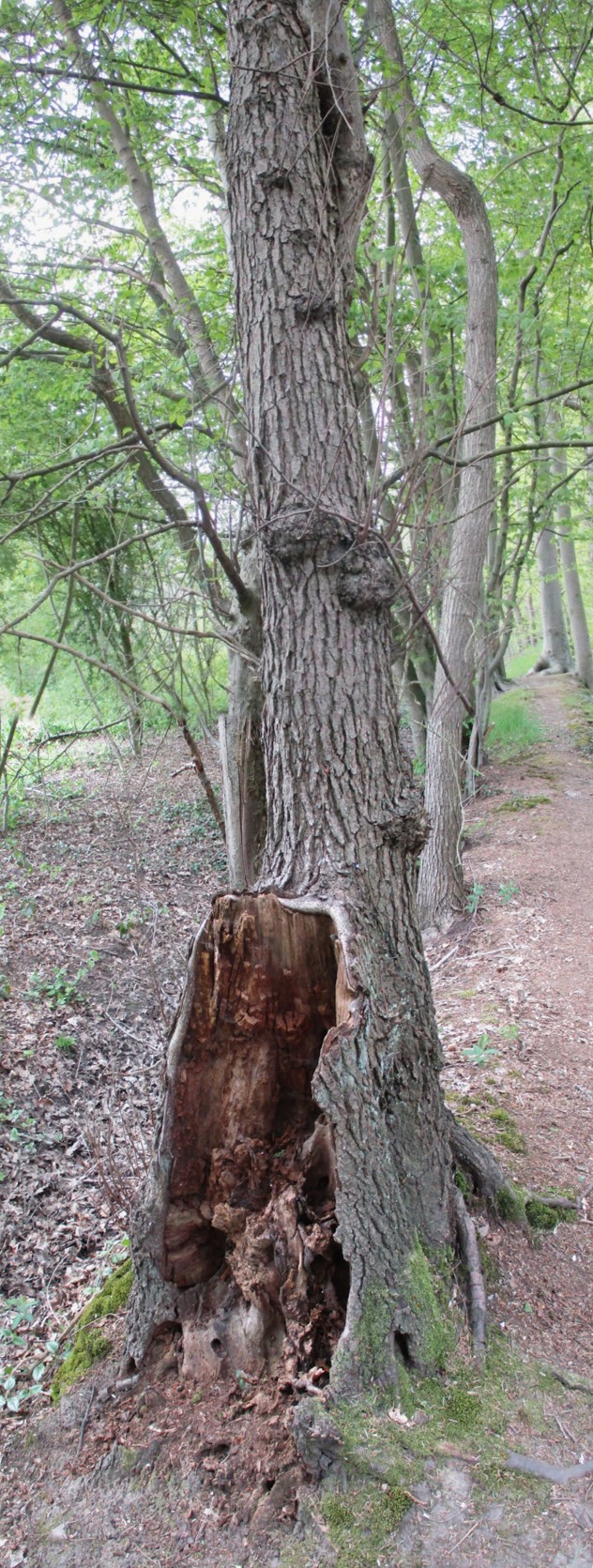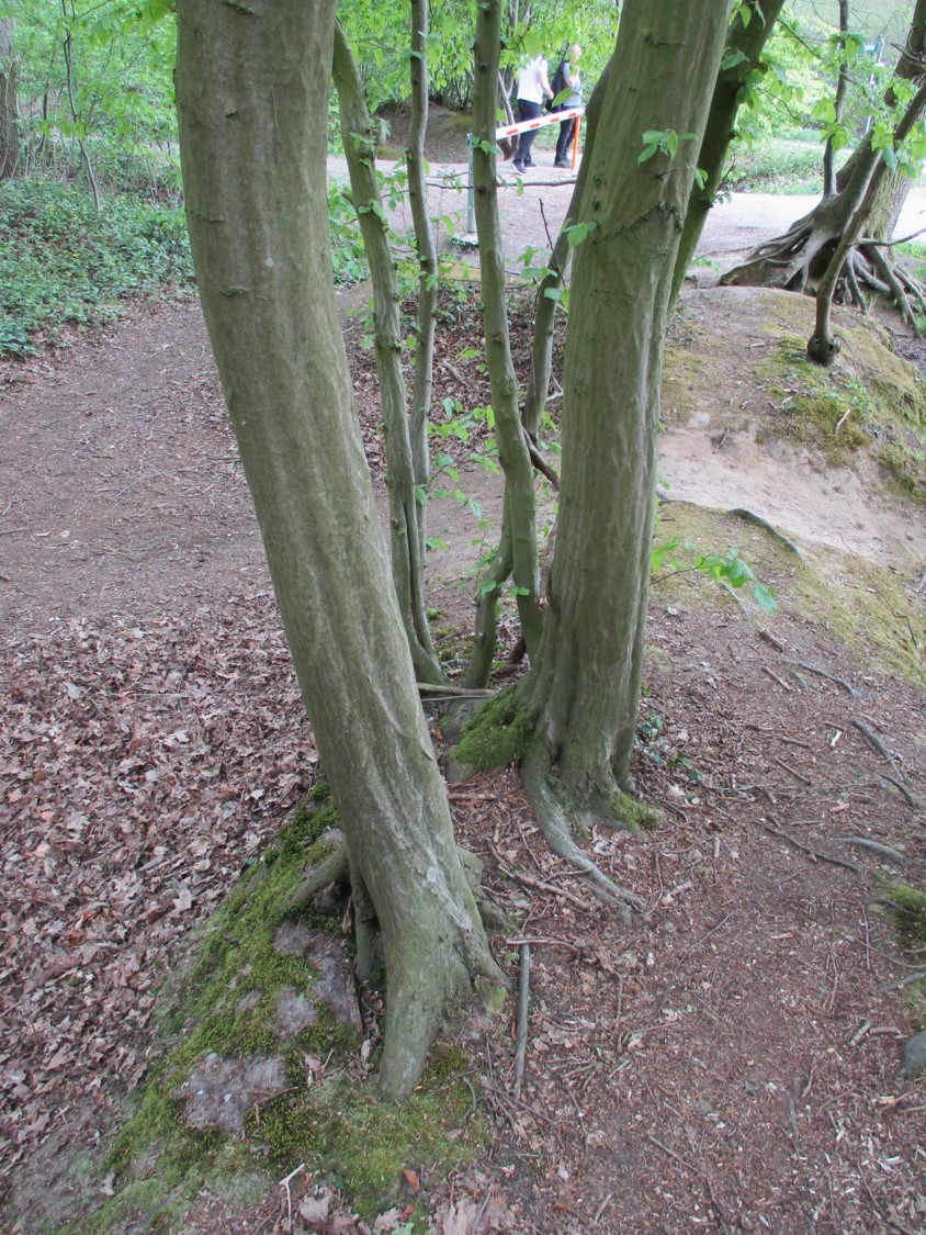 Zwillings-Erle am Waldrand (vermutlich durch frühere Baumnutzung / auf-den-Stock-Setzen), einer lebt, der andere ist vergangen.