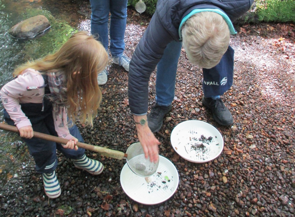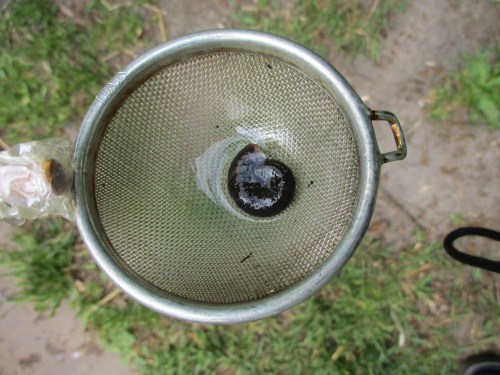 Und dann ist der Kies dran, mit Stiefelrubbeln etwas aufgewühlt, das Sieb in den Abstrom gehalten. – Das kribbelt und krabbelt. Gut das Sieb ausklopfen.