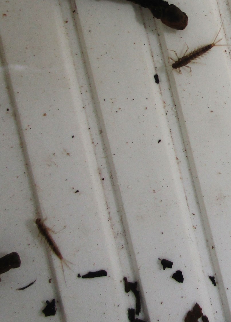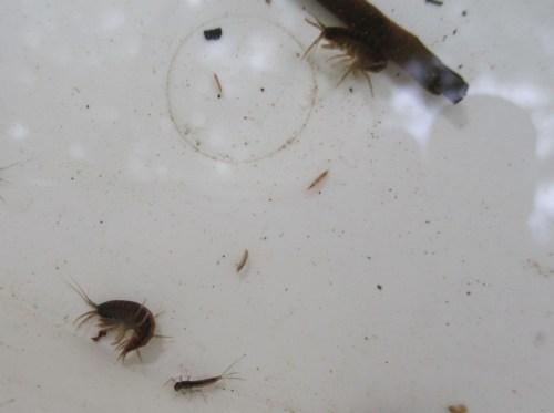Und da sind sie, die Starter der Nahrungskette im naturnahen Bach: Bachflohkrebse jeden Alters, erkennbar an der Vielfalt der Größe (hier nur ein Beispielfoto). Sie zerkleinern ins Wasser fallende Blätter und bieten so einer Vielzahl weiterer Arten eine gute Nahrungsgrundlage.