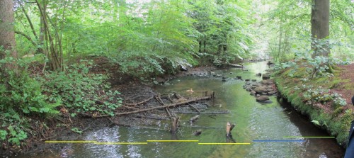 Angekommen. Bis vor wenigen Jahren lief hier in überbreitem, kaputt gebautem und -unterhaltenem Bachbett (gelbe Linien, symbolisch) kraftlos das Wasser der Wedeler Au Richtung Schleswig-Holstein. Die blaue und die grüne Teillinie rechts symbolisieren die wiedergewonnene „arbeitende Breite“ im Niedrig- und Mittelwasserprofil.