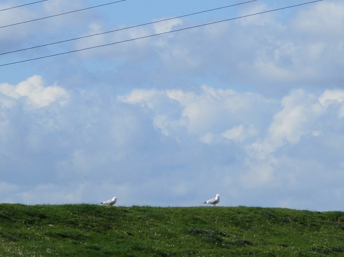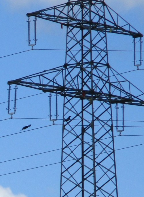 (Junge (?) Kolk- (?)) Raben hatten offenbar Silbermöwen geärgert, vermutlich ihr Gelege bzw. Jungmöwen zu scharf angesehen. – Das haben sie nun davon, vertrieben mit Zwischenstopp auf Hochspannungsmast.