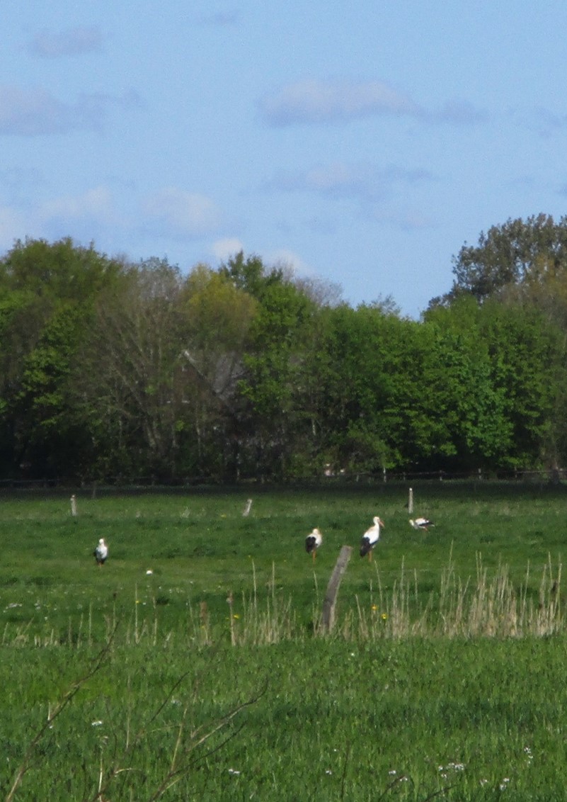 Richtung Hetlingen stehen 4 Störche auf der Wiese – führen die Idenburg-Brüter bereits ihre Jungen aus?