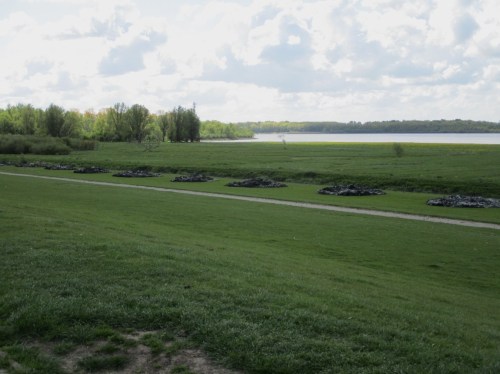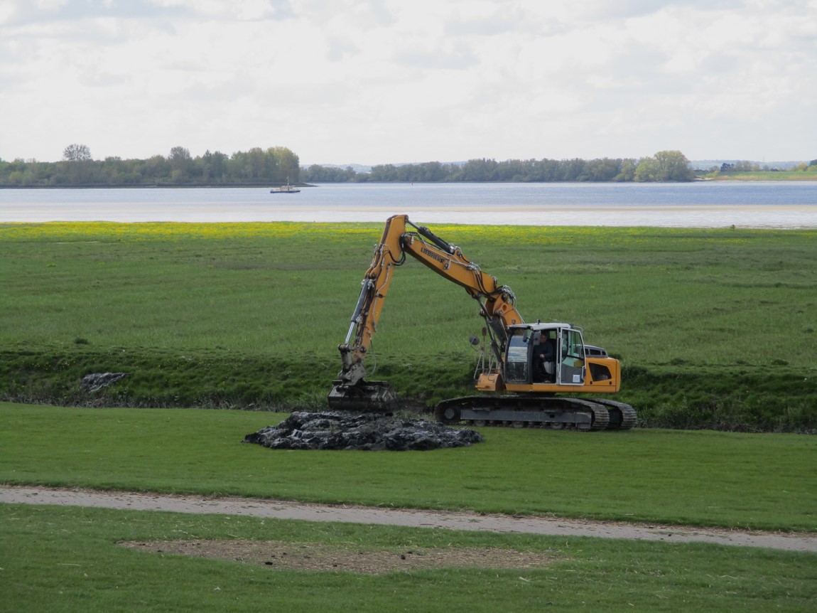 Wie eine saubere Reihe riesige Kuhfladen – LandArt! Der Bagger legt einen Schlickhaufen neben dem anderen an.