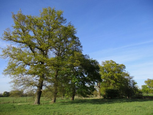 In Bachnähe schlagen die Erlen aus. Im Hintergrund steht eine Eiche, Totholz, das die darauf ausgerichtete Natur noch Jahrzehnte nutzen kann.