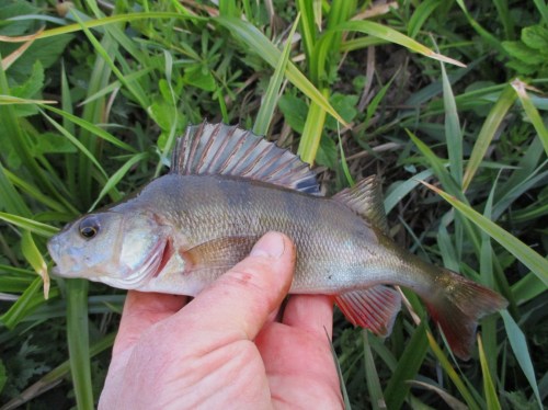Weiter bachab geht, nach vielen kleinen Exemplaren, ein etwas größerer Flussbarsch an die Angel. Der hohe Rücken zeigt sehr gute Nahrungsbedingungen und hervorragendes Abwachsen. Der flache Bauch ist das Ergebnis des offenbar schon stattgefundenen Laichens. – Glück muss der Fisch haben, er soll sich erstmal wieder dick futtern.