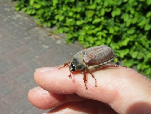 … gehen wir aus der Haustür Richtung Fahrräder und – ich bekomme einen Maikäfer gezeigt. Der hatte sich wohl in unserem Eingang durch Nachtbeleuchtung verflogen. Jetzt sitzt er in der Hecke.