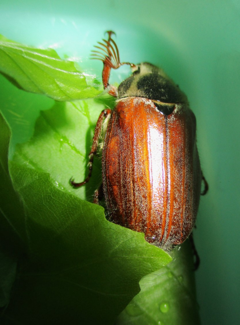 Irgendwie erinnere ich das, gucke zur Sicherheit noch im Internet nach: die Weibchen haben kleinere Fühler mit 6 Blättchen, die Männchen größere mit 7.
