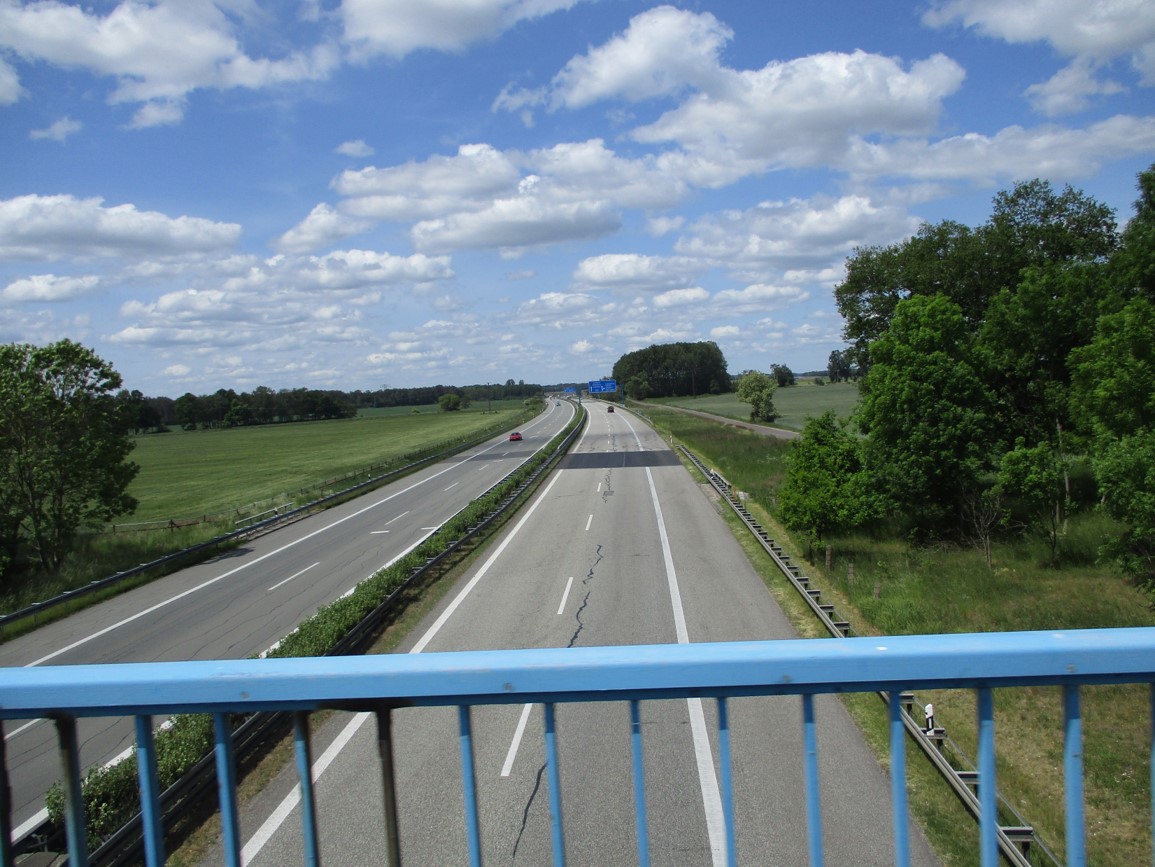 Wir queren eine Bundesautobahn, so gut wie leer – am helllichten Tag?! Geht das? – In Corona-Zeiten schon, hier: die BAB A 24, Hamburg-Berlin.