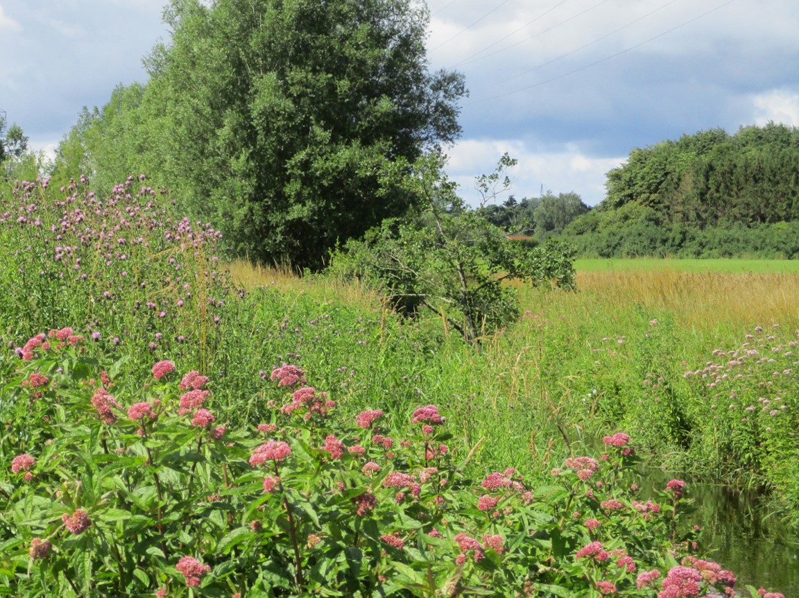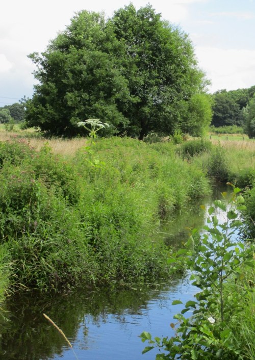 Riesenbärenklau am Bach, blühend – höchste Zeit, die Pflanze zu beseitigen.