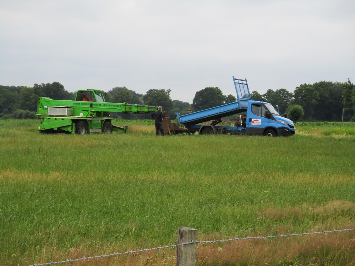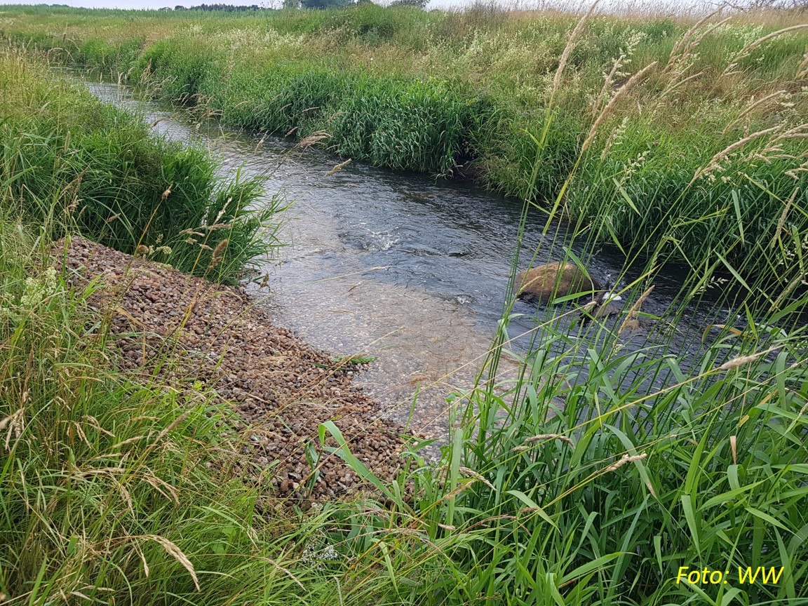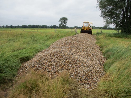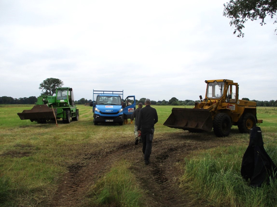 Nun war es Anfang Juli 2020 so weit. Die am linken Ufer der Pinnau liegende Wiese war frisch gemäht, das Heu bei bestem Wetter abgefahren. Alle Beteiligten standen bereit, 3 Lkw Kies lagen vor Ort.