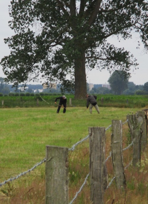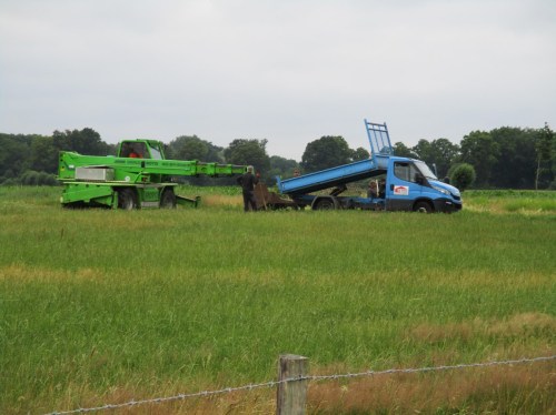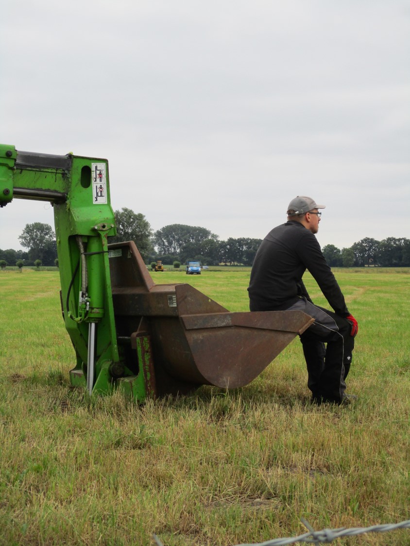 Verabredungsgemäß komme ich etwas später. An der Zuwegung der Pinnauwiese belädt die Belade-Crew per Radlader den Transportwagen.
