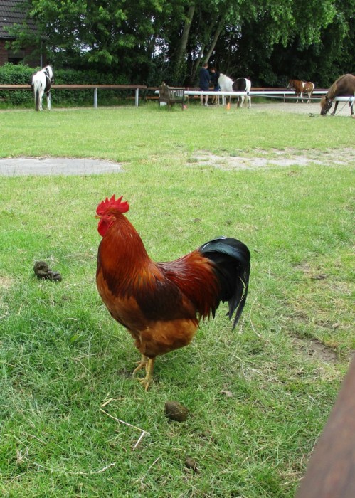 Kinder, so haben wir gehört, nehmen gern Abschied von allen Tieren. Wir begnügen uns mit dem Chef, einem prächtigen Hahn.