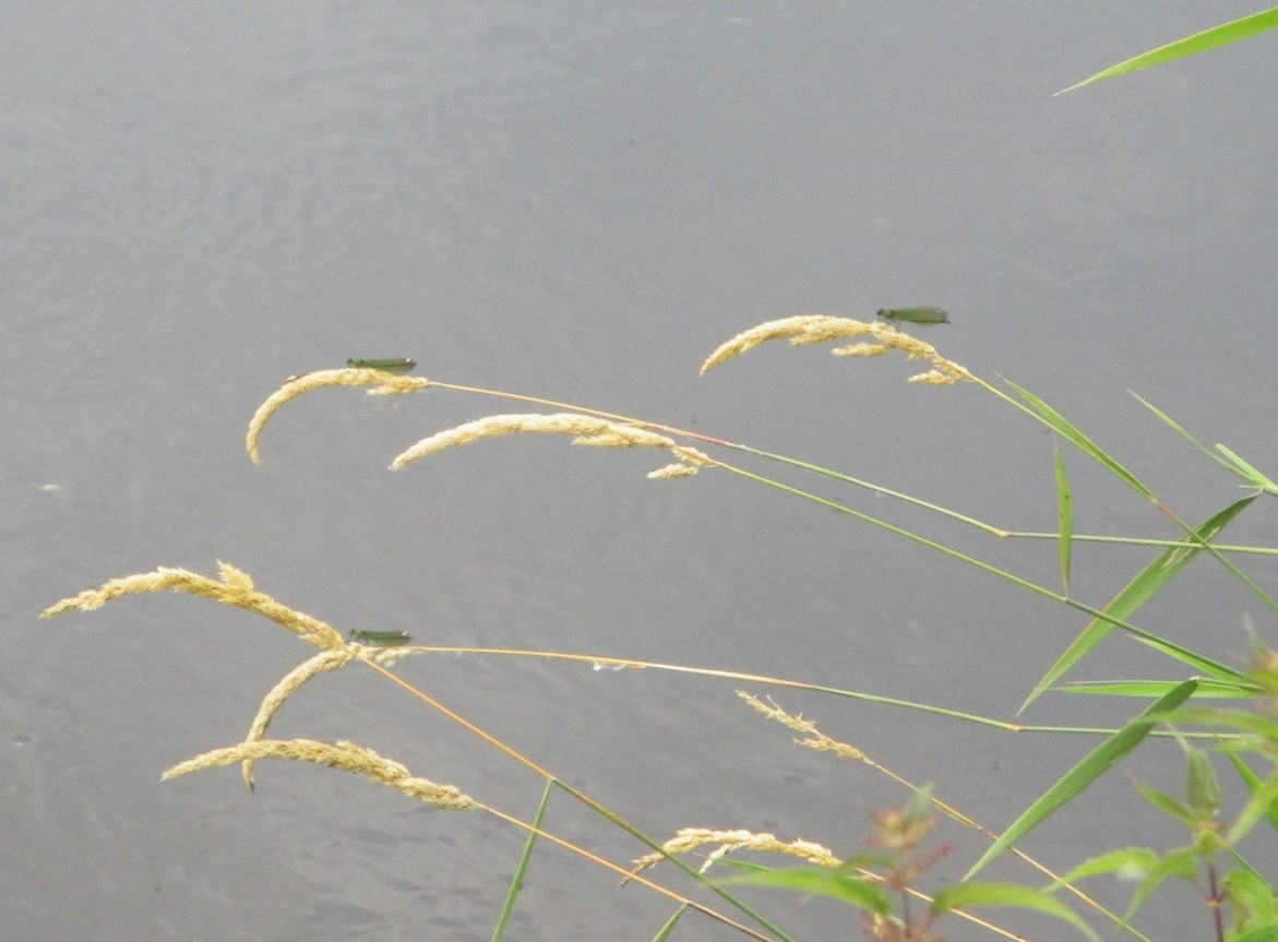 Als Symbol für gewässergeborene Insekten sind wohl Libellen im Juli am Auffälligsten – hier in übersonnter Bachstrecke 3 Weibchen der Prachtlibelle Calopterys splendens.