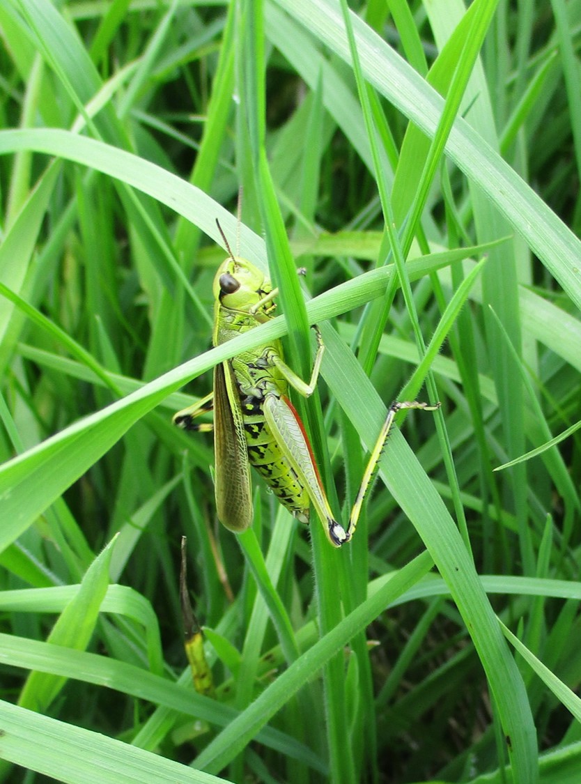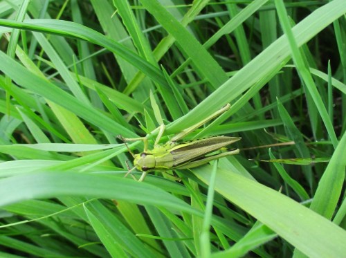 Etliche Pferdeheuwiesen sind noch immer nicht gemäht. Da springt es zahlreich, kleine graubraune Heuschrecken.