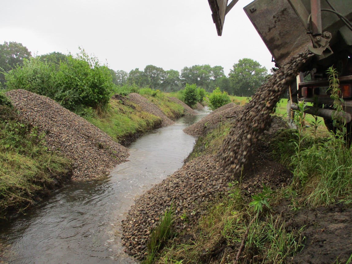 Mit Muldenkipper wird der Kies, eingewiesen, direkt in den Bach und bis auf die Böschung geschüttet. Ich übernehme das weitere Einweisen.