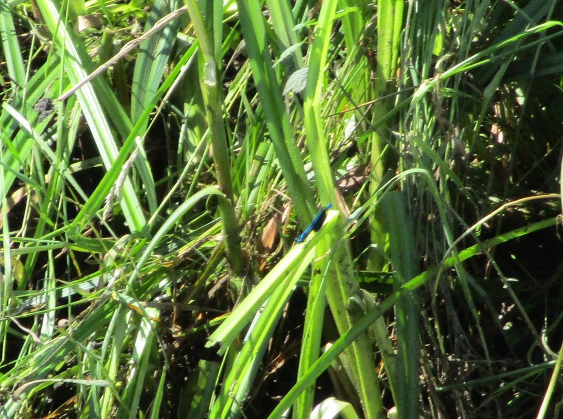 Noch prägt die eher wärmeliebende Calopteryx splendens das Bild. Mit naturnäheren Verhältnissen des sommerkühlen Bachs wird sich ein höherer Prozentsatz der Art Calopteryx virgo einstellen.