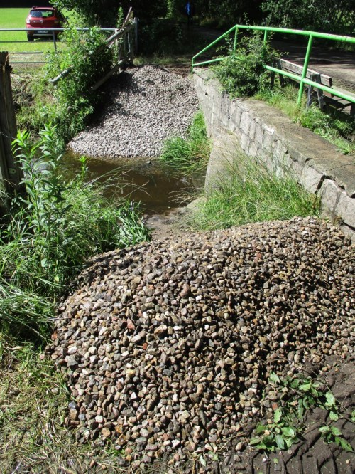 Streckenstart – Beidseitig der Rohrüberfahrt wurde Kies, primär als Erosionsschutz, geschüttet. Mal sehen, was draus wird.