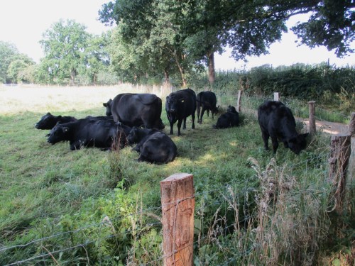 Nachmittags werden die Kühe zur Baum-Buschreihe am westlichen Zaun wechseln. Dort bildet sich mit der Erddrehung stetig wachsender Schatten – Platz satt.