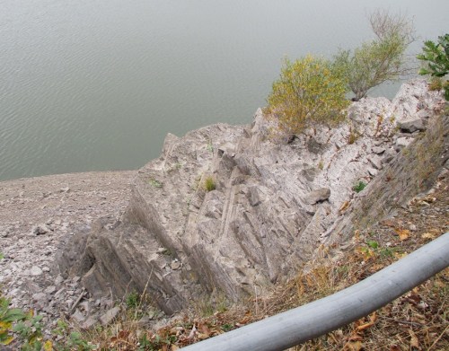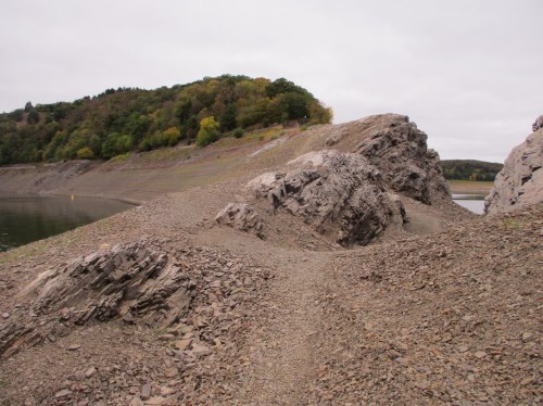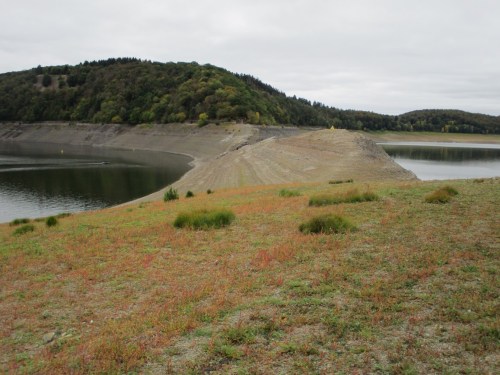 Westlicher Steilhang vor der Sperrmauer – mir fällt auf, dass das Wetter 2020, sicherlich zeitlich zusammen mit den Ablassphasen, Pflanzensukzession hier weitgehend verhinderte.