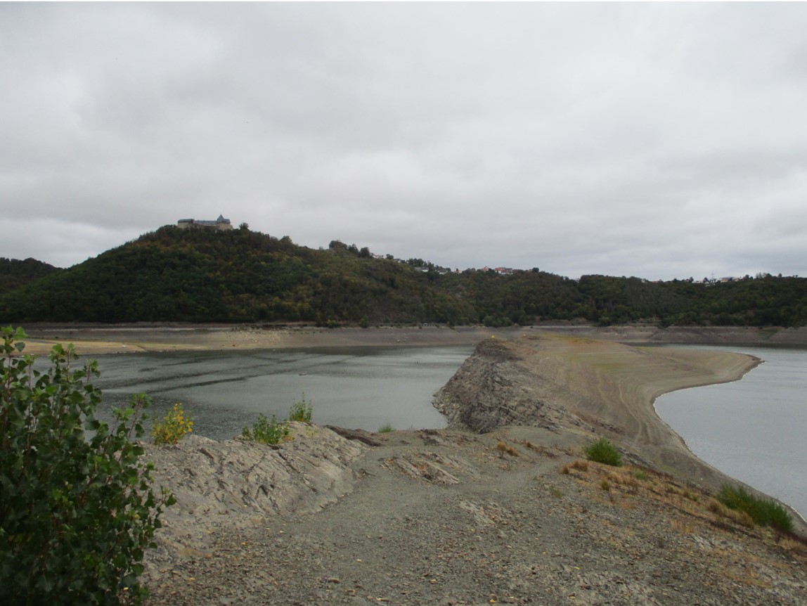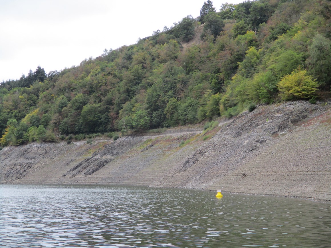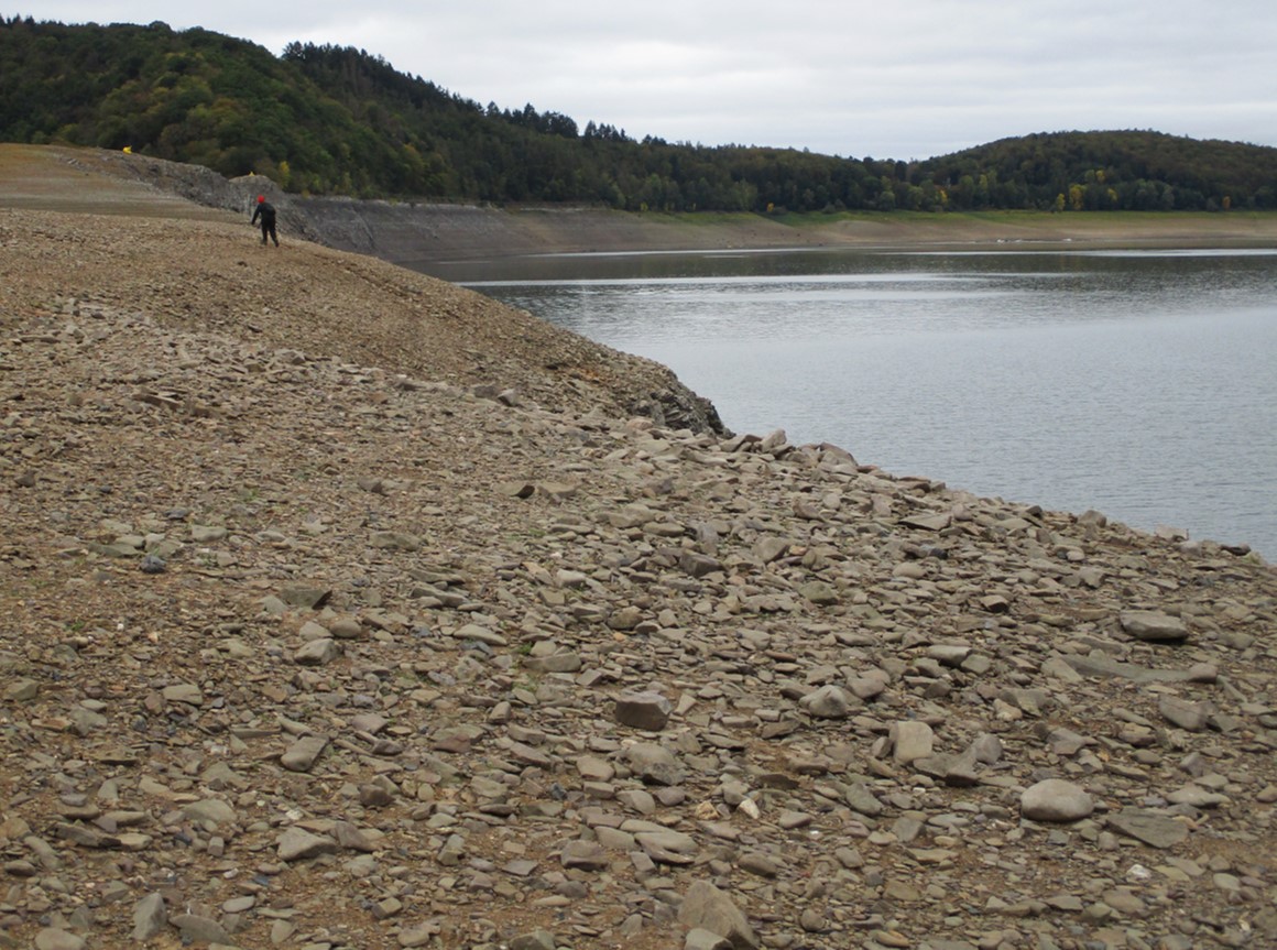 Westlicher Steilhang vor der Sperrmauer – mir fällt auf, dass das Wetter 2020, sicherlich zeitlich zusammen mit den Ablassphasen, Pflanzensukzession hier weitgehend verhinderte.
