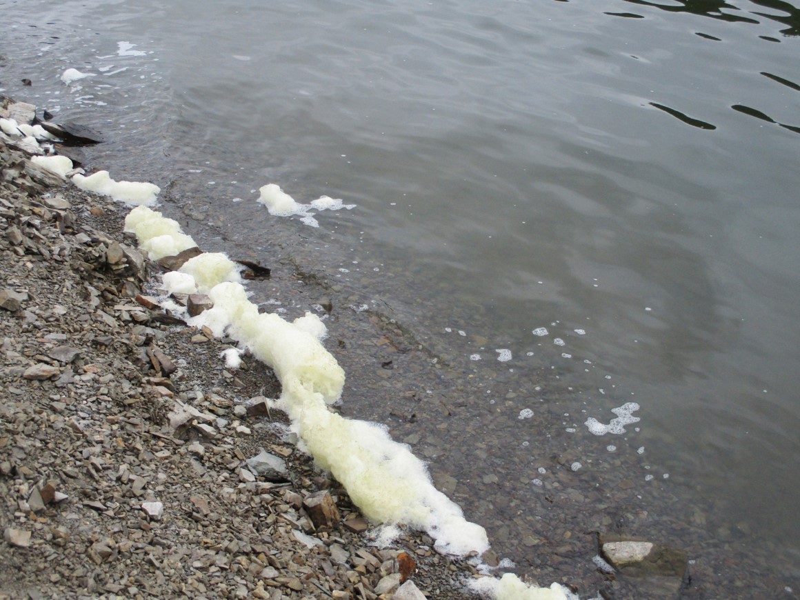 Unten angekommen. Dieser Schaum, so sagten mir Angler später, sei über Nacht im Sperrmauer-zugewandten Restseeteil entstanden.