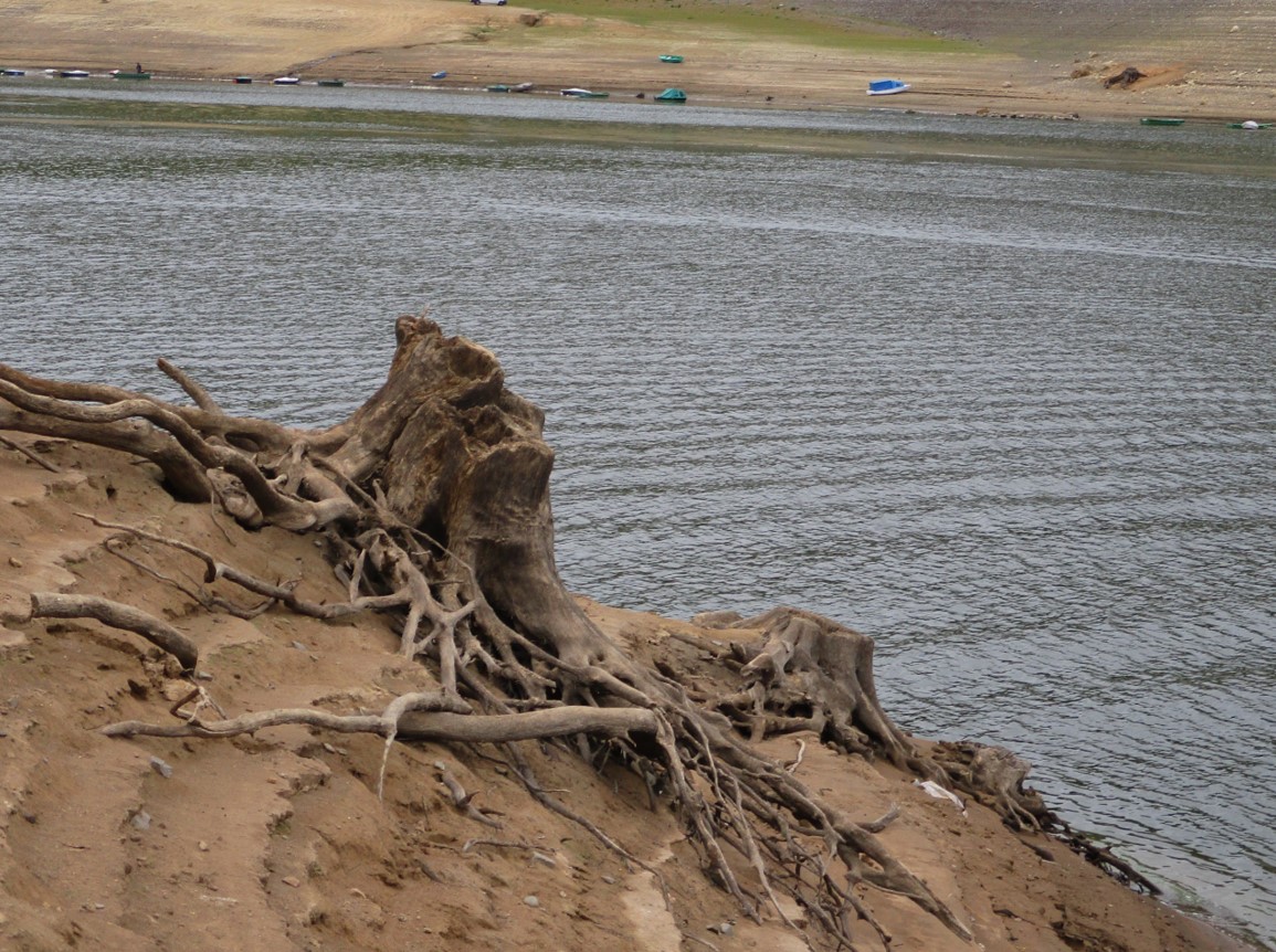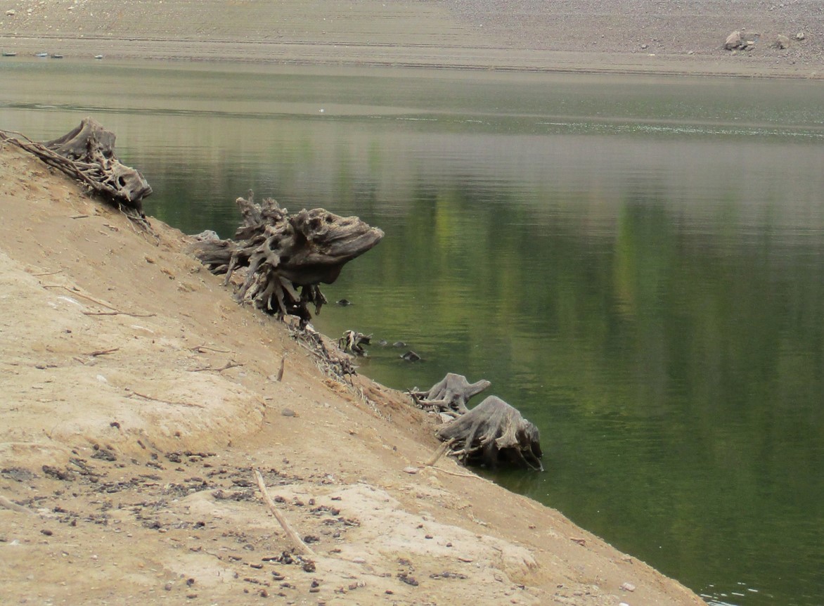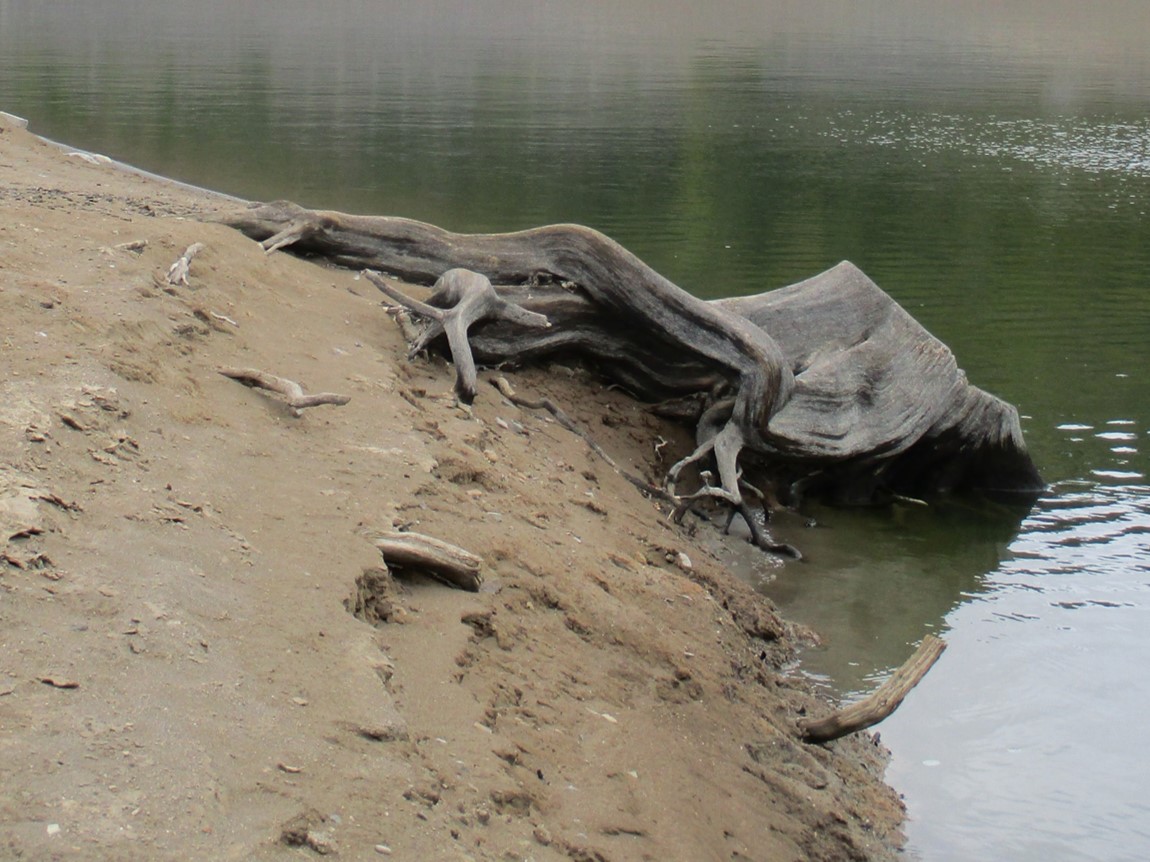 Reptilien, Drachen voraus. Dies ist die berüchtigte „Stukenkante“. An den alten Baumstubben wurde manch teures Angler-Utensil über die Zeit abgerissen. (An solchen Verstecken stehen natürlich bei Überstau auch große Fische!)