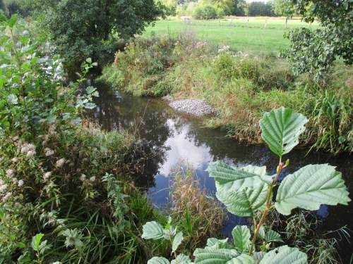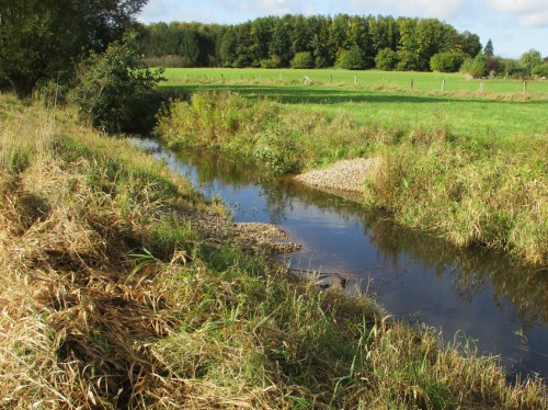 Ein guter Grund mehr also, einmal zu gucken, was die Kollegen vormittags in der anderen Mühlenaustrecke gebastelt hatten. Dort wurden von festem Untergrund mit Bagger 150 t Kies nach und nach in Muldenkippern punktuell in die mehrere hundert Meter lange Strecke platziert. Anschliessend legte der Bagger mit Anweisung des Verbandsvorsitzenden und eines engagierten Anglers des Fischereipachtvereins [Link im vorigen Bericht] Teile aus solchen Depots um – teils als Strömungslenker, teils als Rauschen.