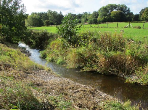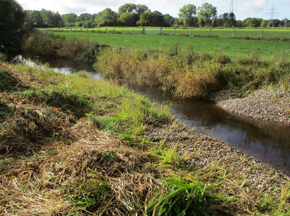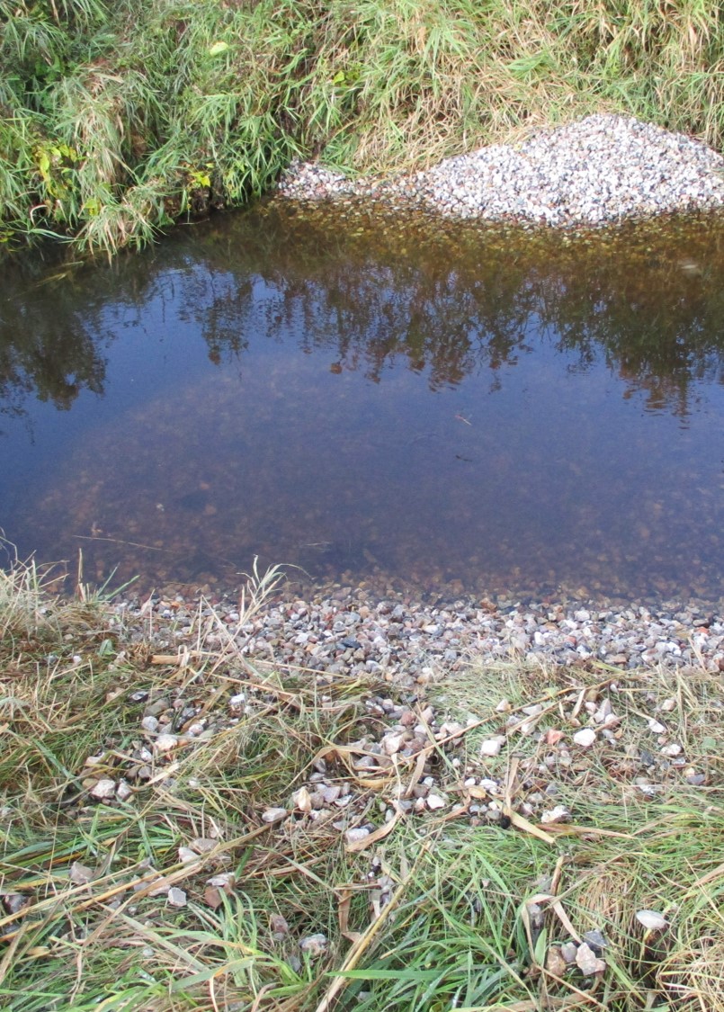 Hier legte der Bagger Kies aus dem Depot vorn links ans andere Ufer direkt gegenüber. Durch die beiden Schüttwinkel, ggf. mit etwas Zugabe auf die Sohle bildet sich eine Rausche.